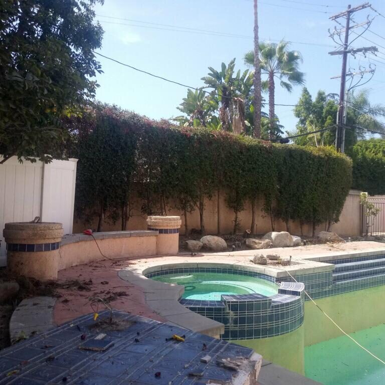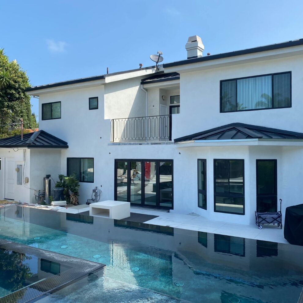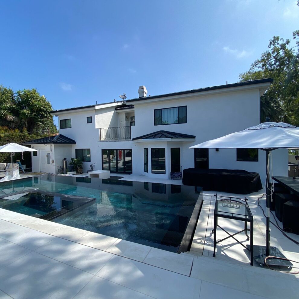 This project included a complete redesign of the exterior of the house, including the backyard landscaping and a full-size, infinity-edge pool and custom jacuzzi. All the custom concrete work, swimming pool, and pool-side BBQ island, complete with sink and mini-fridge gave this homeowner their own paradise getaway right in the heart of Beverly Hills.